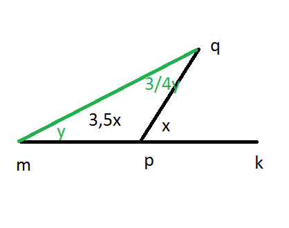 обозначив градусную меру угла qpk переменной х, получаем из условия, что градусная мера угла qpm равна 3,5х