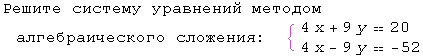 у выражаем из уравнения (любого, которое проще), например из 4х+9у=20. у=(20-4х)/9, у=(20+4*4)/9=36/9=4.Ответ:х=-4, у=4