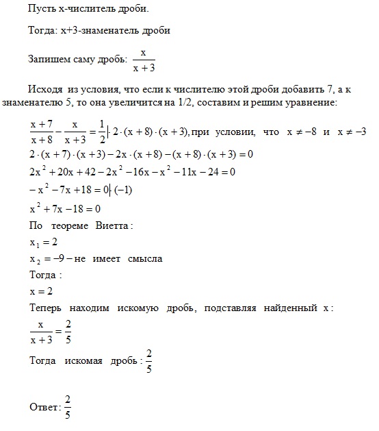 Знаменатель обыкновенной дроби больше ее числителя на 3. Если к числителю этой дроби прибавить 7, а к знаменателю 5, то она увеличится на 12. Найдите эту дробь.