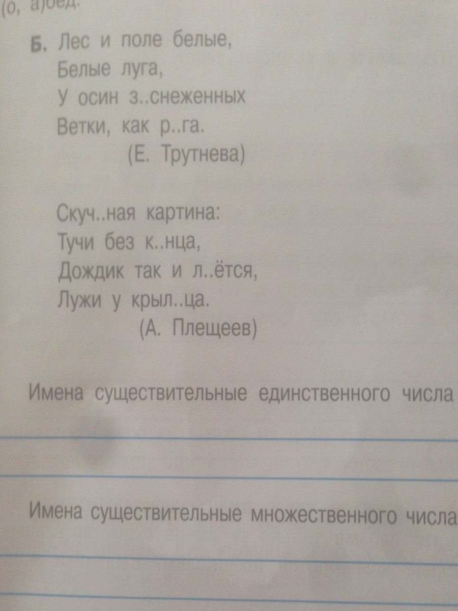 Единственного числа ( 1 стих ) Лес и поле Множественного числа ( 1 стих ) Луга,осин, ветки, рога Единственного числа ( 2 стих ) Картина, дождик Множественного числа ( 2 стих ) Тучи, лужи