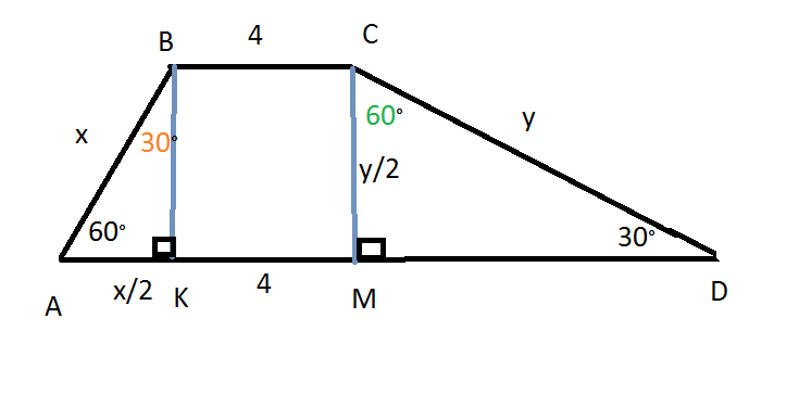 Основания трапеции равны 4см и 8см. Углы при большем основании равны 30 и 60 градусов. Найдите длины боковых сторон трапеции. (Решите, пожалуйста, отвечать не только с ответом, но и решением)