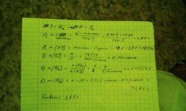 Хлор какой массы необходим для получения йода из технического иодида калия массой 19,8г., в котором массовая доля не содержащих йод примесей равна 6,44 %