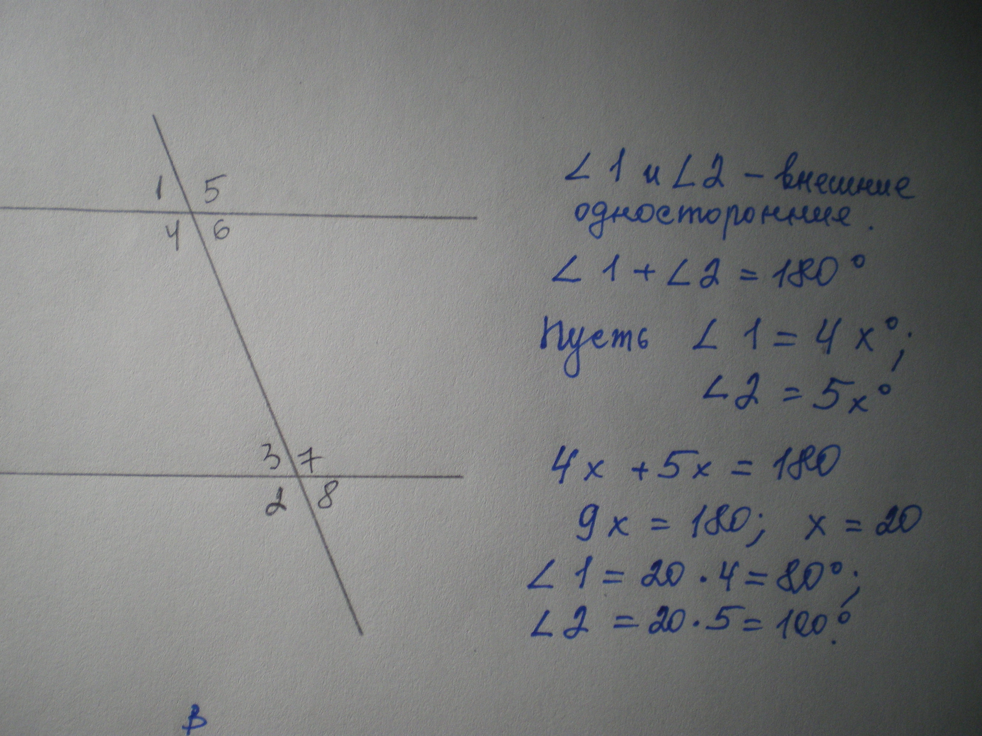 Пусть х — коэффициент пропорциональности, тогда ∠1 = 4x; ∠2 = 5x