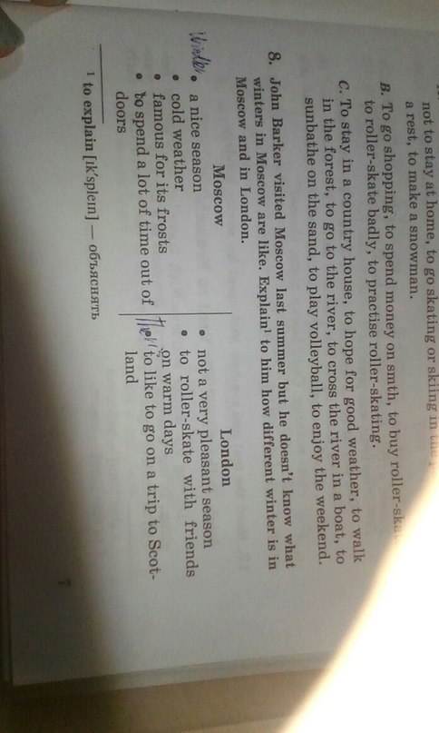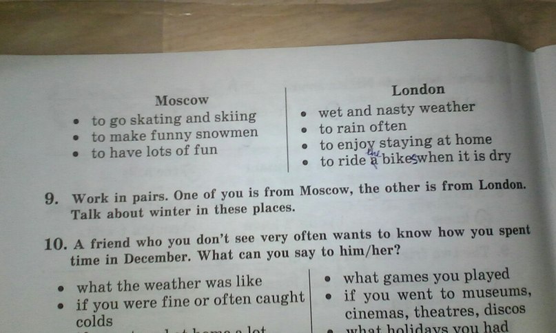Moscow is my motherland and it's beautiful in every season. One of them is winter. You know that all children like to play snowball in winter.I like too. My family go skating & skiing every winter. My dad is a painter. He is very talented. That's why he helps us to make funny snowman. He is good in it.We enjoy of making snowman to get her. Ant it makes people to have lots of fun. Enjoy your life! London is my favorite city. Even it is rainy and foggy city I like it very much. When we visit London with my family , I enjoy to stay at home if the weather is wet and nasty Actually my brother studies in London.Thou We go there constantly. And I have a lot of friends there too. We like to ride bikes when the weather is dry. I advice you to go there to.