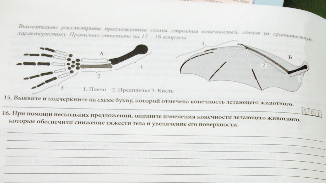 Конечность летающего животного под буквой Б. Эта конечность принадлежит летучей мыши - единственному млекопитающему способному к самостоятельному полету. О том, что животное летающее, говорят тонкие перепонки на крыльях между удлиненными пальцами...