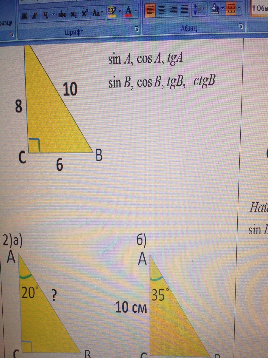 синус отношение противолежащей к гипотенузе. синус А =СВ/АВ=0,6. косинус отношение прилежащего к гипотенузе. косинус А=АС/АВ=0,8