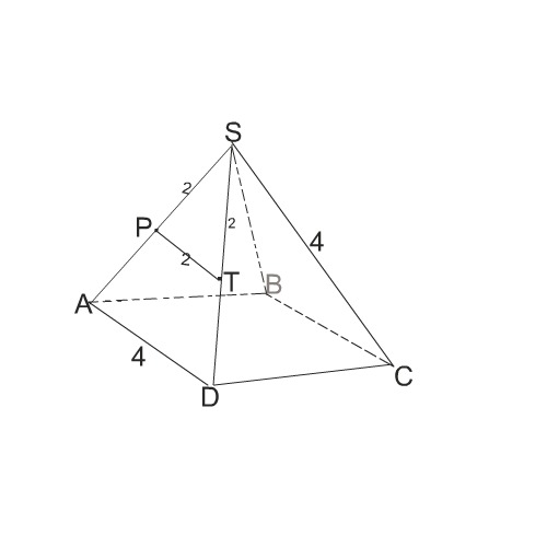 Помогите пожалуйста!:)Задача вроде бы и не трудная, но в голову ничего не лезет.)) Точки P и T - середины ребер и правильной четырехугольной пирамиды SABCD(S - вершина), длина каждого ребра кторой равна 4 сантиметра. Вычислите длину радиуса окружности, вписанной в треугольник PST.