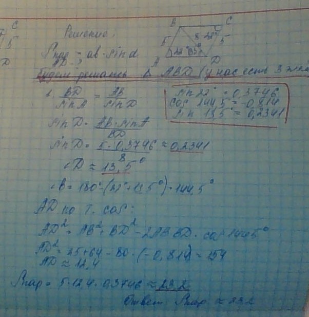 В параллелограмме АBCD сторона AB=5, угол А=22, диагональ BD=8. Найдите площадь параллелогоамма.