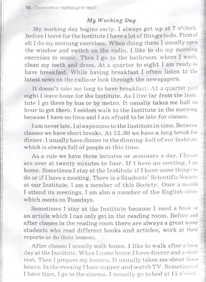 Мой рабочий день начинается рано. Я всегда встаю в 7 часов. Перед тем, как пойти в Институт, мне надо сделать множество вещей. Сперва, я делаю зарядку. Когда я делаю упражения, я обычно открываю окно и включаю радио. Я люблю делать зарядку под музыку. Затем я иду в ванную комнату, где умываюсь, чищу мои зубы и одеваюсь. В 7.45 я готов завтракать. За завтраком я обычно слушаю последние новости по радио или просматриваю газеты.
