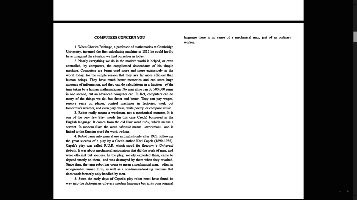 2. Почти всё, что мы делаем в современном мире нам помогают и даже контролируют компьютеры, сложные потомки этой простой машины. Компьютеры всё более и более широко используются в современном мире (сегодняшнем), хотя бы по той простой причине, что они более эффективнее, чем люди. У них гораздо лучше память и они могут хранить огромное количество информации, они могут сделать вычисления за маленькую долю времени, необходимого для математика-человека. Ни один живой человек не может сделать 500000 сумм в секунду, а усовершенствованный компьютер может. Фактически компьютеры могут делать те же самые вещи, что и мы, просто быстрее и лучше. Они могут выплачивать зарплату, бронировать места на самолеты, контролировать машины на заводах, предположить погоду на завтра, даже играть в шахматы, писать стихи, сочинять музыку.