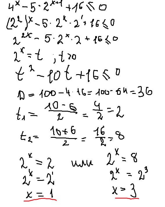 T>=2 2^x>=2 x>=1 в пересечении с t<=8 2^x<=2^3 x<=3