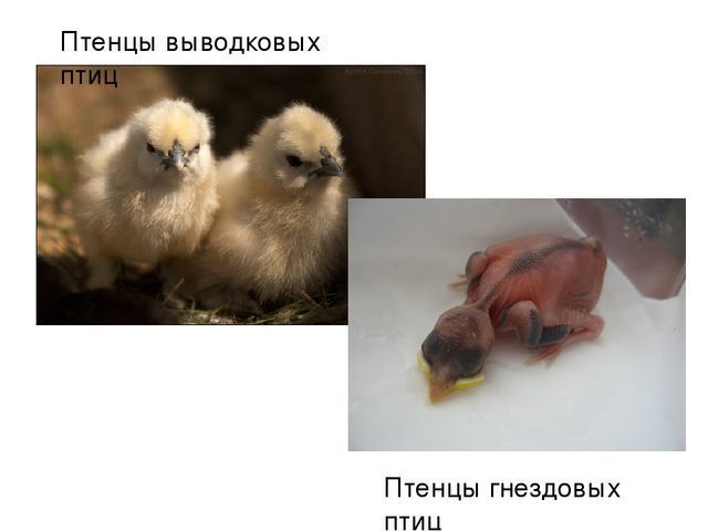 Гнездовые птицы - птенцы беспомощные, голые, слепые, нуждаются в заботе родителей, выкармливаются до вылета из гнезда.