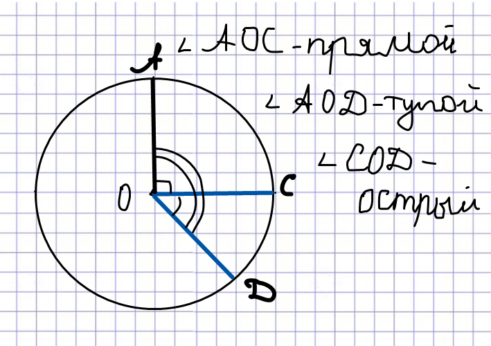 построй круг радиус которого 3см.проведи в нем 3 радиуса чтобы получились прямой,тупой и острый угол.