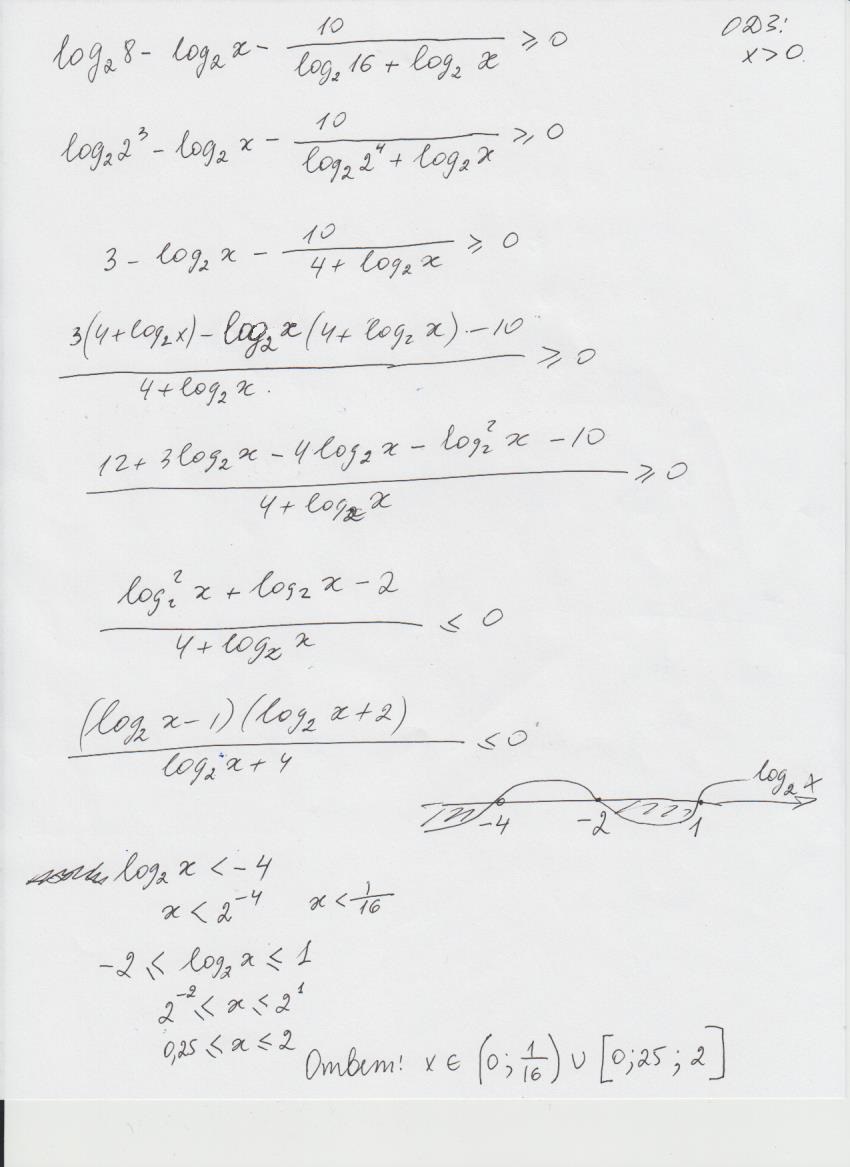 Логарифмическое неравенство. Log2(8/x)-10/log2(16x)>=0. Более подробно во вложении. Желательно с объяснениями.