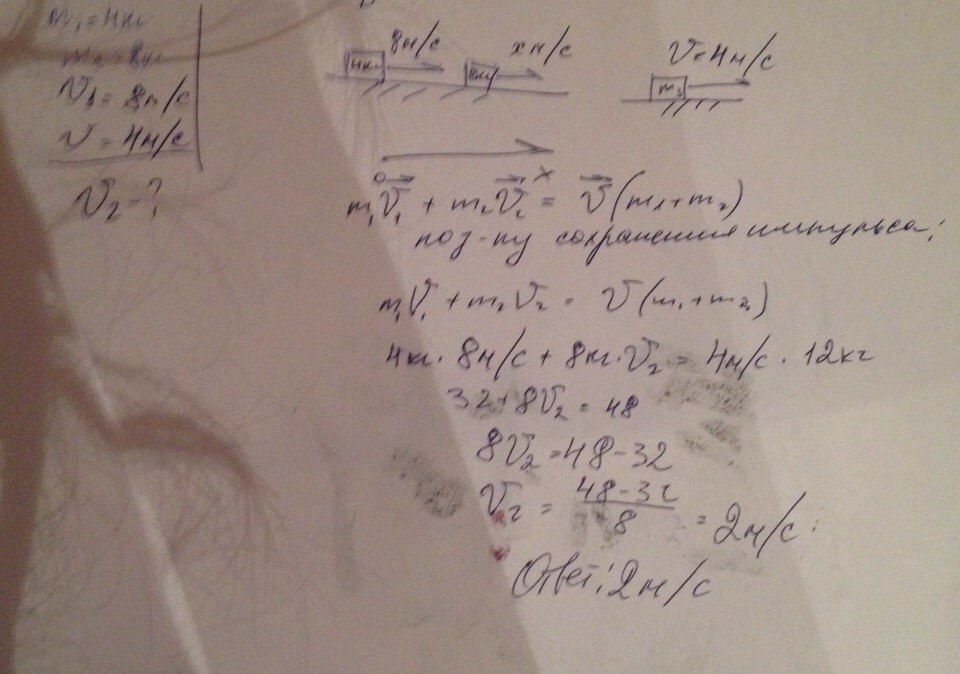 Между двумя шарами массами 4 кг и 8 кг, движущимися вдоль одной прямой в одном направлении, происходит неупругое соударение. После соударения они продолжают соместное движение со скоростью 4 м/с. С какой скоростью двигался второй шар до соударения, если первый шар имел скорость 8 м/с?