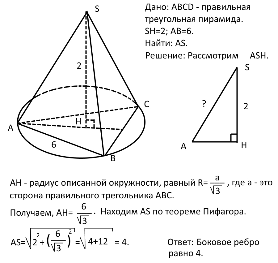 В правильной треугольной пирамиде высота равна 2, а сторона основания равна 6. Найдите боковое ребро