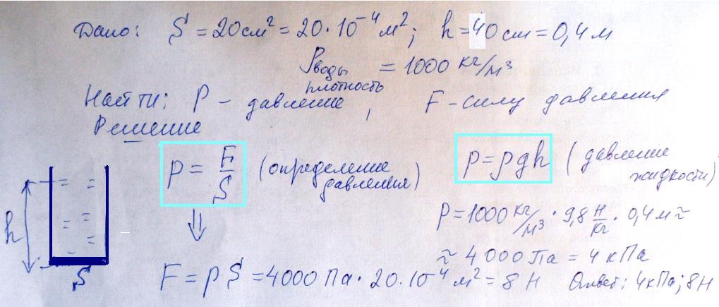 Определите давление и силу давления воды на дно сосуда , если площадь основания 20 см2 и высота жидкости в сосуде 40 см.