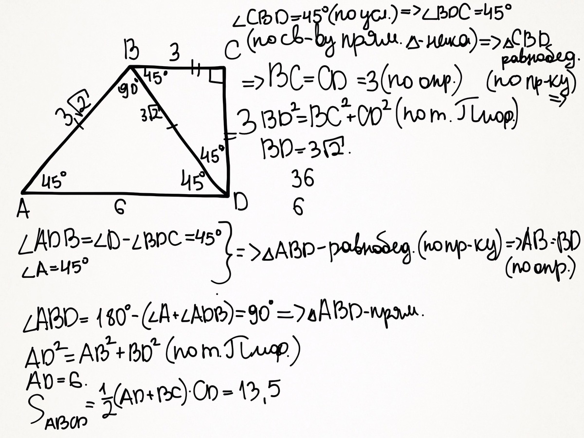 В прямоугольной трапеции меньшая боковая сторона равна 3 дм и составляет с меньшей диагональю угол 45 градусов .Острый угол трапеции равен также 45