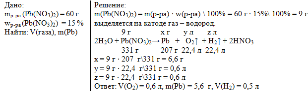 Какую массу свинца можно получить, проводя электролиз водного раствора нитрата свинца (II) массой 60 г? Массовая доля соли в растворе равна 15%. Какой объем газа, измеренный при нормальных условиях, выделится при электролизе?