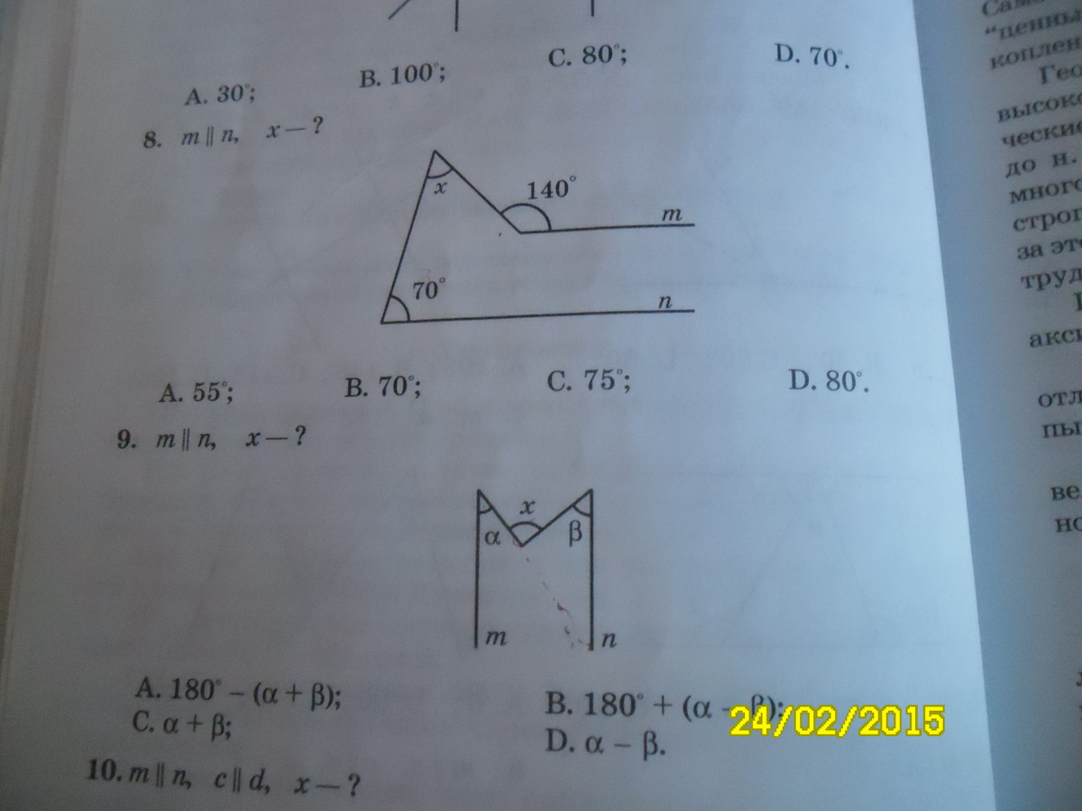 8) если продлить m - получится треугольник - углы которого 70 (соответственный с 70 и 40 - смежный со 140) тогда x=180-(70+40)=70