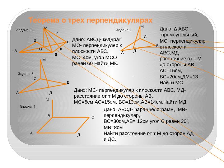 Помогите пожалуйста! Очень надо! ABCD-квадрат, МО-перпендикуляр к плоскости ABC, МС=4 СМ, угол МСО=60 градусов. Найти: МК. (первая задача на рисунке)