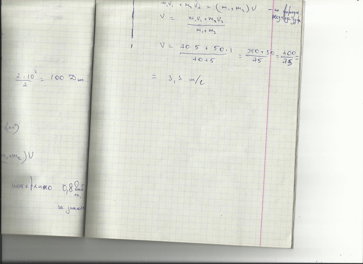 Человек, массой 70 кг, бегущий со скоростью 5 м/c, догоняет тележку массой 50 кг, движущуюся со скоростью 1 м/c, и вскакивает на нее. С какой скоростью они будут продолжать движение?