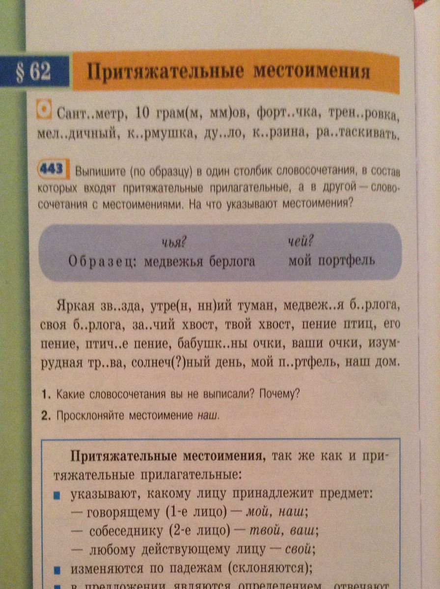Яркая звезда(звезда какая?яркая).Утренний туман(туман какой?утренний).Медвежья берлога(берлога чья?медвежья).Своя берлога(берлога чья?своя).Заячий хвост(хвост чей?заячий).Твой хвост)хвост чей?твой).Пение птиц(пение кого?птиц).Его пение(пение кого?его).Птичье пение(пение какое?птичье).Бабушкина очки(очки чьи?бабушкины).Ваши очки(очки чьи?ваши).Изумрудная трава(трава какая?изумрудная).Солнечный день(день какой?солнечный).Мой портфель(портфель чей?мой).Наш дом(дом чей? наш).Вот пожалуйста!