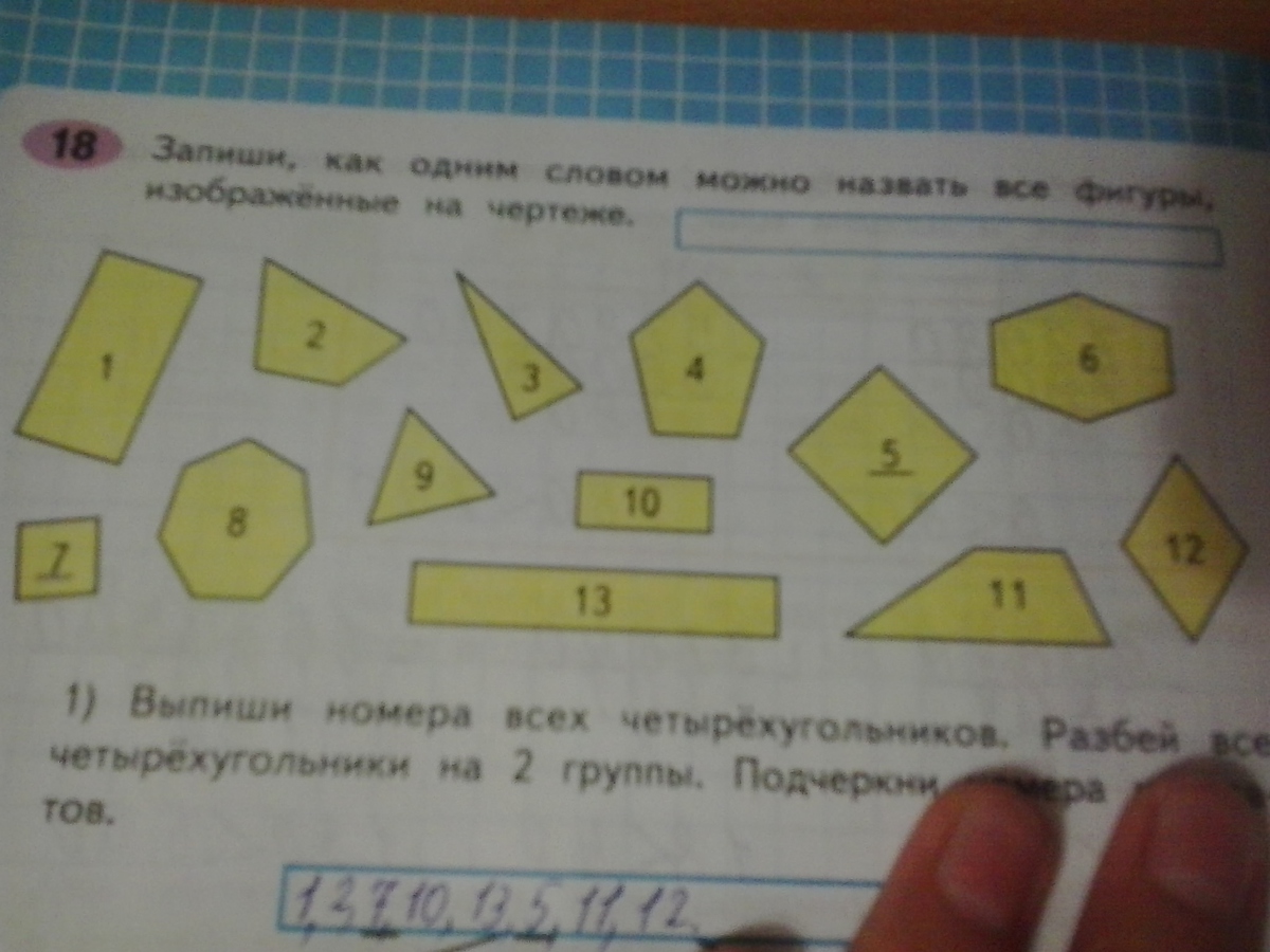 Запиши,как одним словом можно назвать все фигуры изображённые на чертеже. (№18)