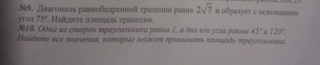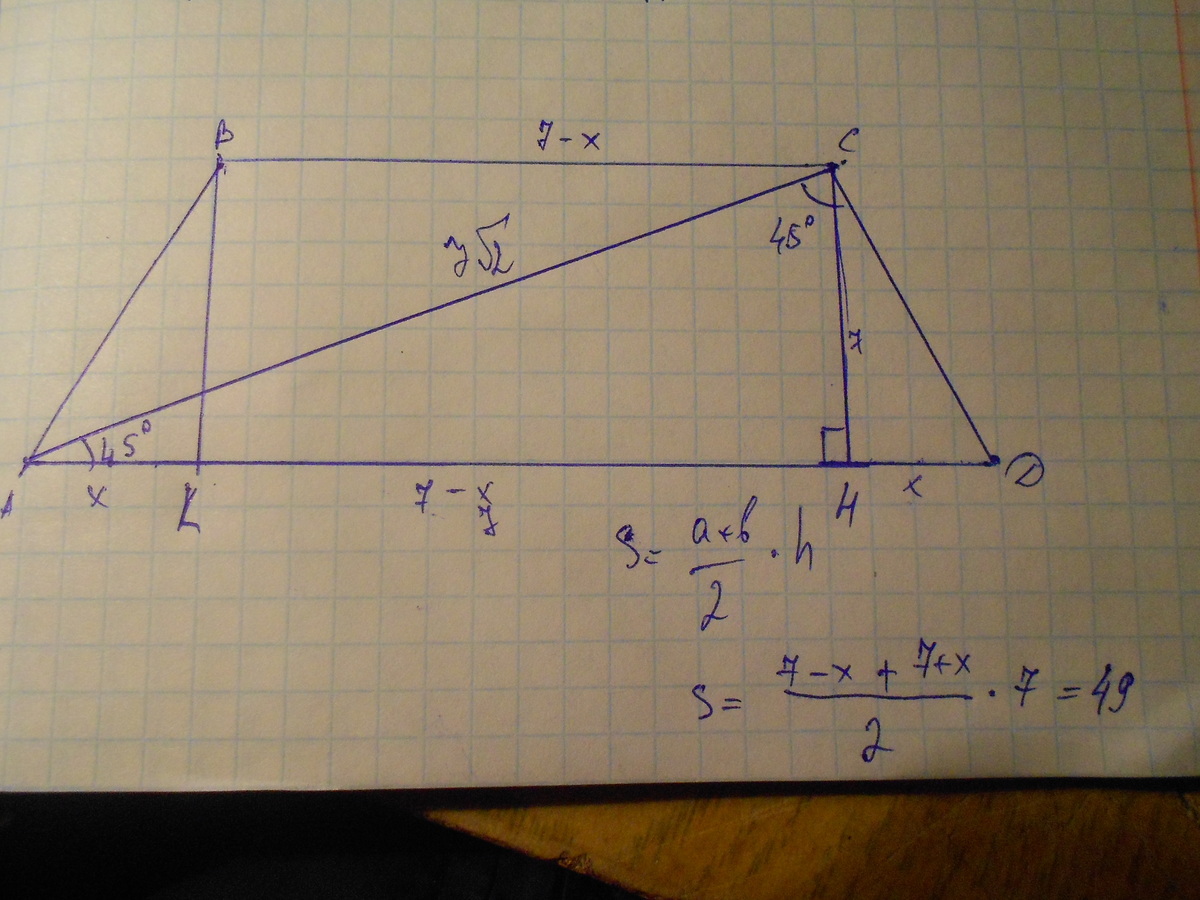 Проведем высоту СН.Рассмотрим треугольник АСН. угол САН=углу АСН (сумма острых углов в прямоугольном треугольнике равна 90 градусов).значит АН=СН=7(по теореме пифагора) S=((BC+AD)/2)*h. АК=HD (трапеция равнобедренная) - Возьмем за Х.ВС=7-Х. S=((7-X+7+X)/2)*7=49
