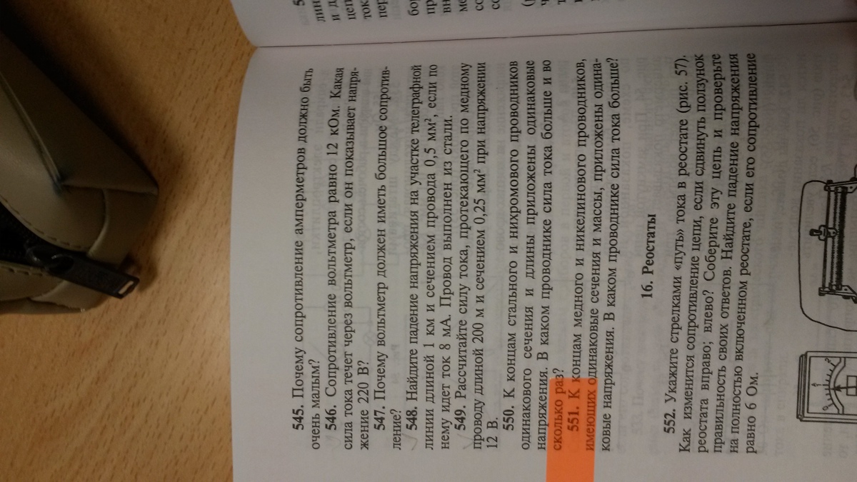 549. Рассчитай сопротивление R=ро*l/S и по закону Ома найди силу тока, ро меди 0,017 Ом*мм2/м