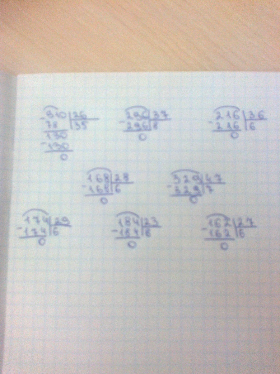 Выполнить деление с объяснениями в столбик 216:36 910:26 296:37 168:28 329:47 174:29 184:23 162:27