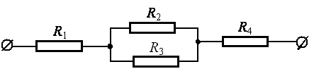 Чему равно общее сопротивление участка цепи, изображенного на рисунке, если R1=1 Ом, R2=10 Ом, R3= 10 Ом, R4= 5 Ом?