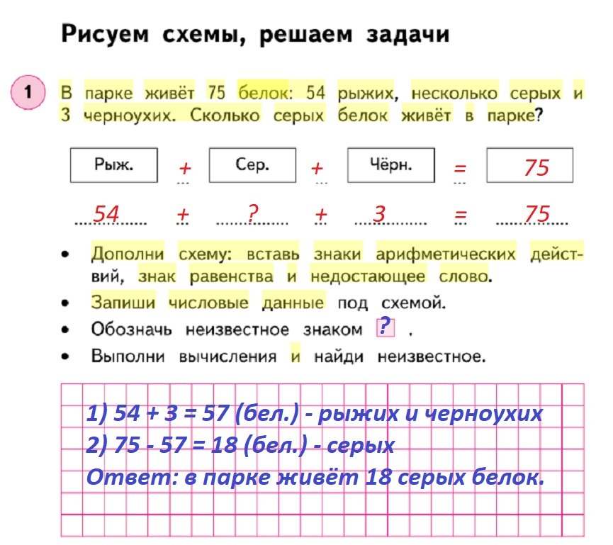 В парке живёт 75 белок:54 рыжих,несколько серых и 3 черноухих.Сколько серых белок живёт в парке? Дополни схему:вставь знаки арифметических действий,знак