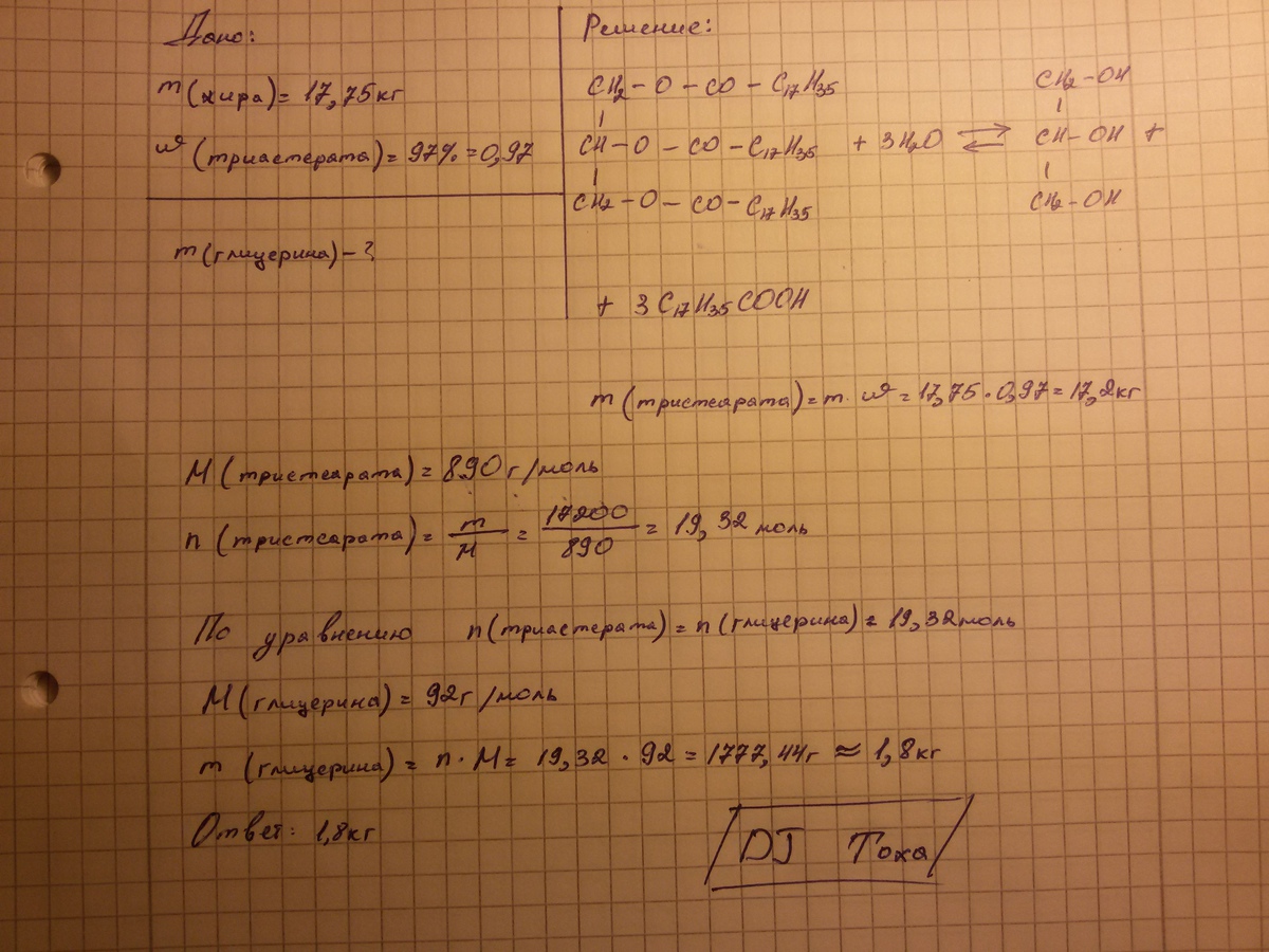 Какую массу глицерина можно получить из природного жира массой 17.75 кг , содержащего 97% тристеарата глицерина ?