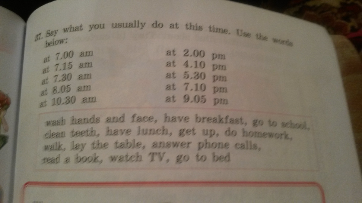 At 7:00 am I get up.At 7:15 am I wash hands,face and clean teeth.At 7:30 am I have breakfast.At 8:05 am I go to school.At 10:30 am I do my homework.At 2:00 pm I lay the table and have lunch.At 4:10 pm I walk.At 5:30 pm I read a book.At 7:10 pm I answer phone calls and watch TV.At 9:05 pm I go to bed.