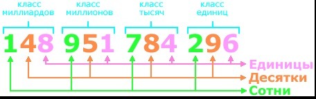 В каждом классе цифры справа налево обозначают единицы, десятки и сотни этого класса