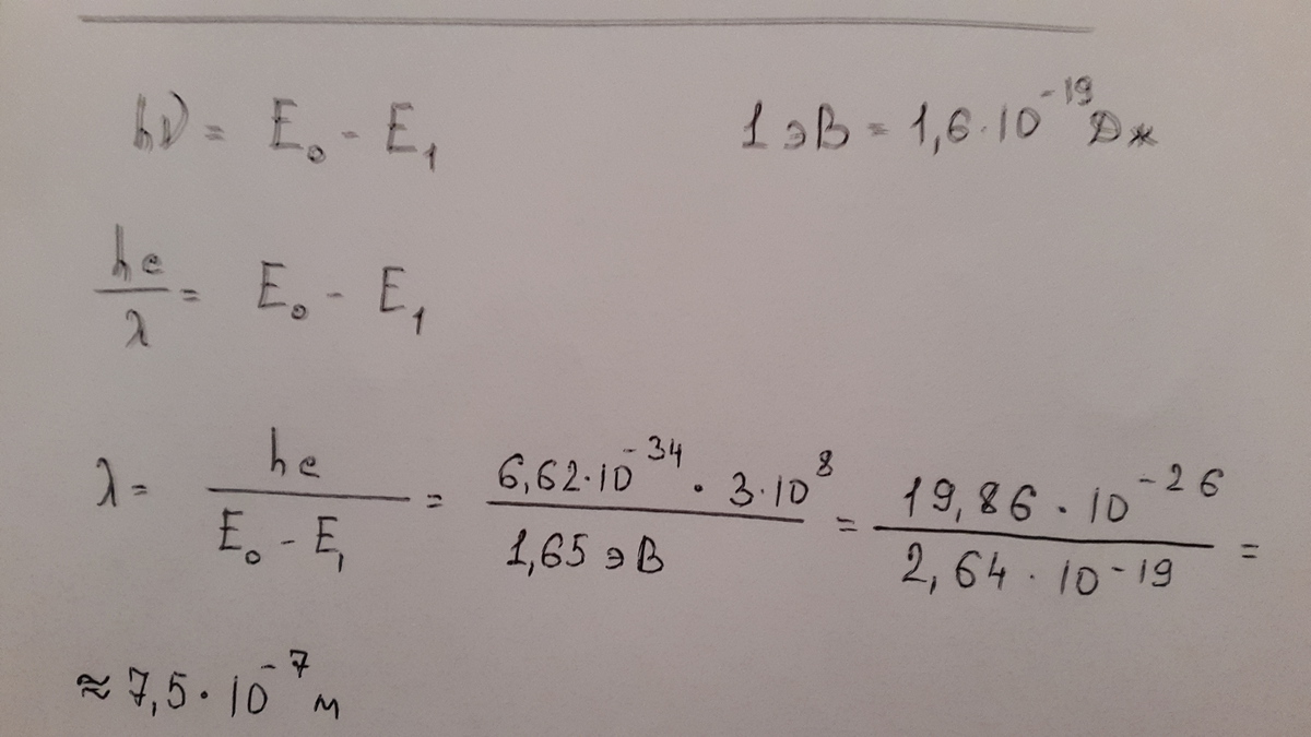 Электрон в атоме переходит из состояния с энергией -3, 4 эВ в состояние с энергией -1, 75 эВ. Какова длина волны поглощаемого при этом фотона?