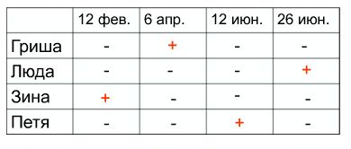 Гриша, Люда, Зина, Петя родились 12 февраля, 6 апреля, 12 июня, 26 июня. Интересно, что Петя и Люда родились в одном месяце, а Зина и Петя родились в один и тот же день разных месяцев. Когда родился Гриша.