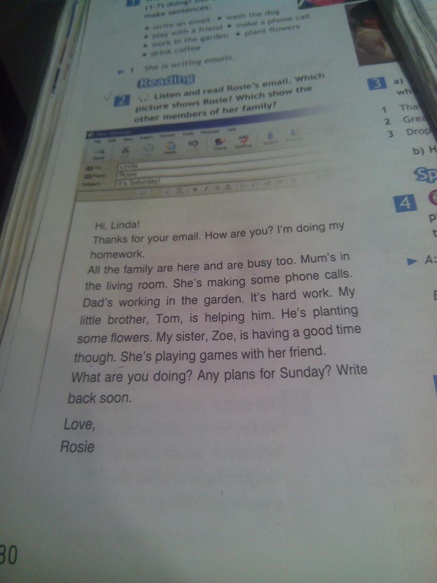 Привет, Линда! Я делаю мою благодарность за вашу электронную почту. Как дела? домашнее задание. Мама во всех семьи здесь и заняты слишком. гостиная. Она делает несколько телефонных звонков. Отцы, работающие в саду. Это тяжелая работа. Мой младший брат, Том, помогает ему. Он посадки цветы. Моя сестра, Зоя, оказывает хорошее время, хотя она играет со своим другом игры Что вы делаете? Какие планы на воскресенье? Ответь как можно скорее Любовь Рози