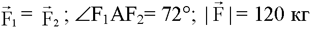 Две равные по величине силы приложены к одной точке под углом 72 градуса друг к другу.Найдите величины этих сил, если величина их равнодействующей равна 120 кг???Решение распишите подробно пожалуйста!!!