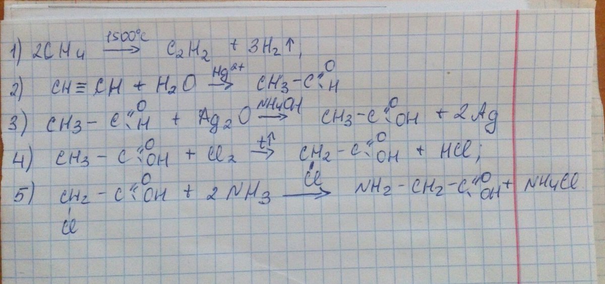цепочка превращения метан--ацитилен--ацетальдегид--уксусная кислота--монохлоруксусная кислота --аминоуксусная кислота