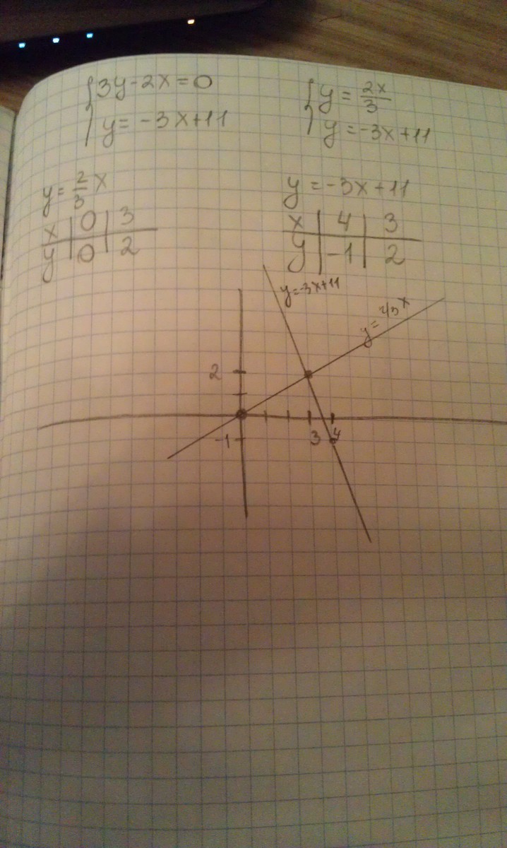 прямые пересекаются в точке с координатами (3;2), значит х = 3 y = 2