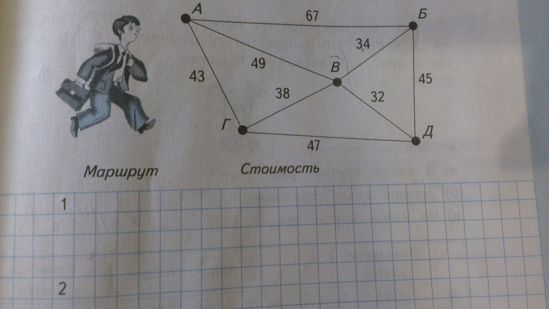 а)Составьте 3 маршрута для коммивояжёра,находящегося в пункте А.Маршрут обозначайте последовательностью посещаемых пунктов,например АБДВГА.