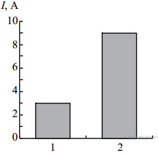 На рисунке приведена столбчатая диаграмма. На ней представлены значения силы тока в двух проводниках (1) и (2) одинакового сопротивления. Сравните значения работы тока А1 и А2 в этих проводниках за одно и то же время.