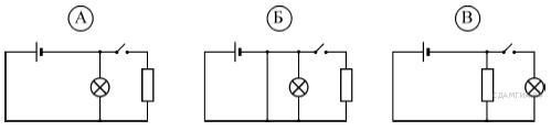 На рисунке приведены схемы трёх электрических цепей. В каких из них лампочка не горит? Электрические ключи везде разомкнуты.