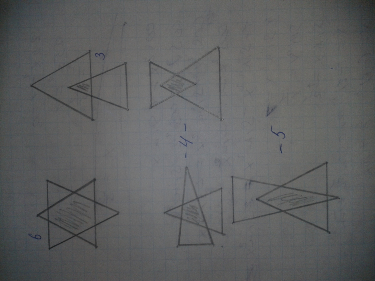 Начерти два треугольника так, чтобы их общей частью был 1) треугольник 2) четырёхугольгик 3) пятиугольник 4)шестиугольник