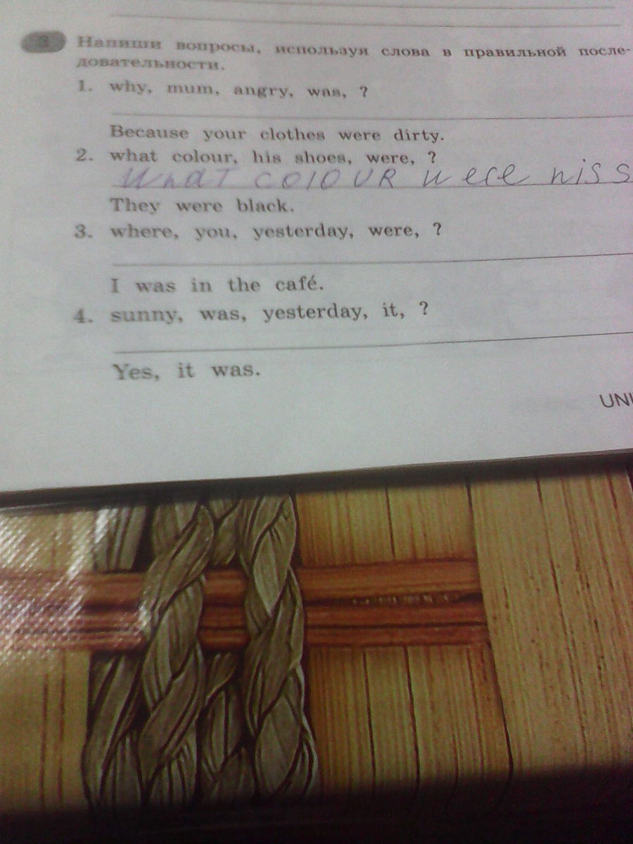 1 . Why mom was angry? 2. What color were his shoes? 3. Where you were yesterday? 4. Was it sunny yesterday?