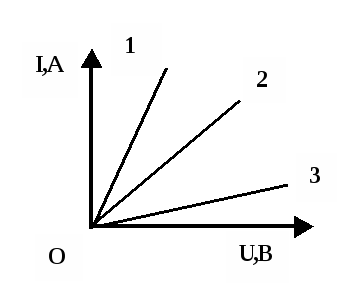 На рисунке приведены графики зависимости силы тока в металлическом проводнике от напряжения. Электрическое сопротивление наибольшее у проводника