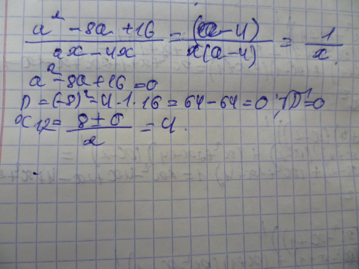а^2-8а+16/ах-4х=(a-4)^2/x(a-4)=a-4/x