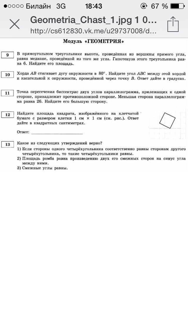 Найти площадь квадрата, изображенного на клетчатой бумаге с размером клетки 1 см Х 1 см. Ответ дайте в см2 (номер 12)